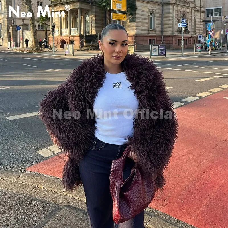 네오 민트 겨울 2025 트렌드 버건디 오브세션 롱 페이크 몽골리안 양털 재킷 코트 여성용 시크 라펠 칼라 플러피 오버코트