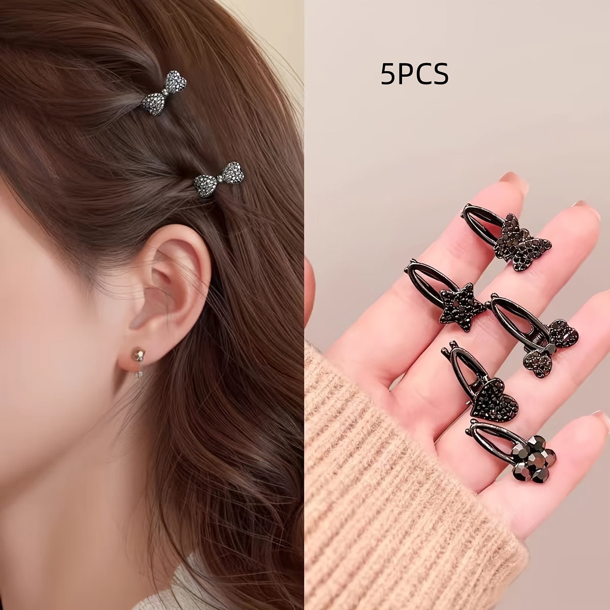 TEMU 고급 스톤 장식 소형 리본 사이드 덕빌 클립 5개 세트, 미니 앞머리 클립, 헤어 액세서리