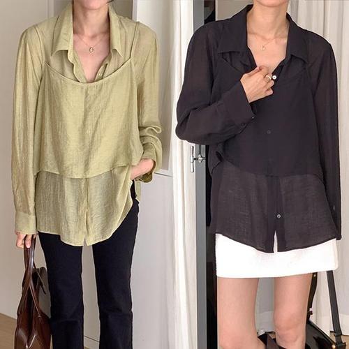 파라노말샵 / (투피스) 유넥 긴팔티 싱글 나시 더블 세트(파라노말