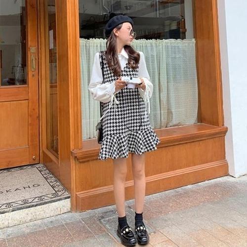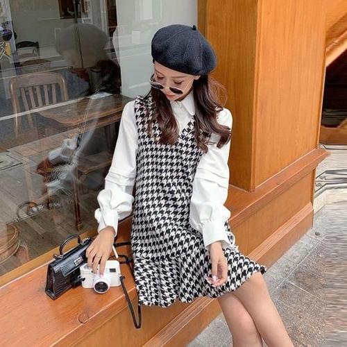 민소매 드레스체크무늬 와이셔츠 투피스 스타일 WFK212T