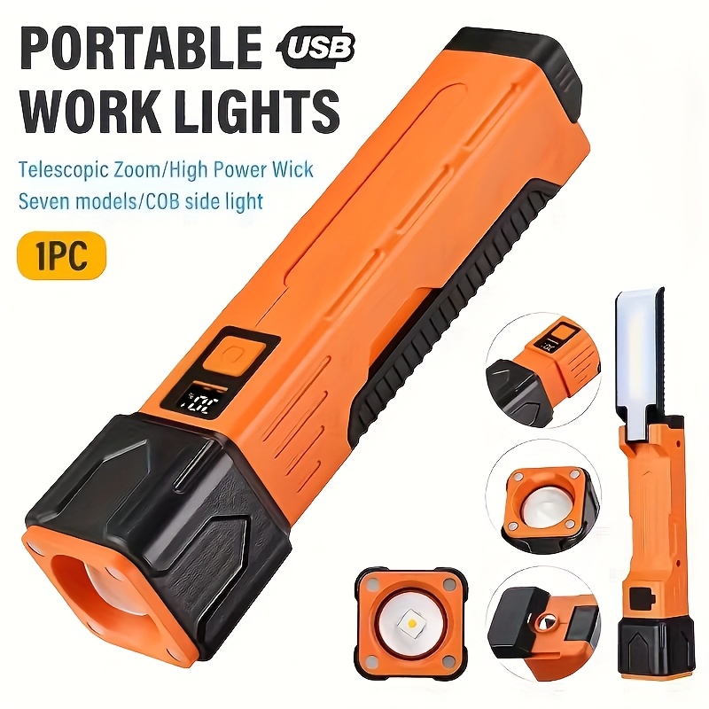 TEMU LED 작업용 손전등 (자석 받침대 포함) | 3가지 조명 모드, 다기능 망원 줌 디자인, 고휘도 COB 보조 램프, 독서 및 캠핑용 소형 데스크 램프, USB 충전식, 18650 리튬 배터리 - 아웃도어, 정비공에게 적합