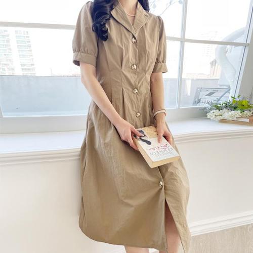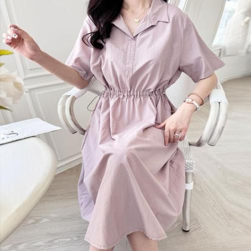 패션 여성용 바스락 원피스 빈티지 정장넥 블루 롱원피스 셔링 허리조임 반팔 셔츠원피스 LCC