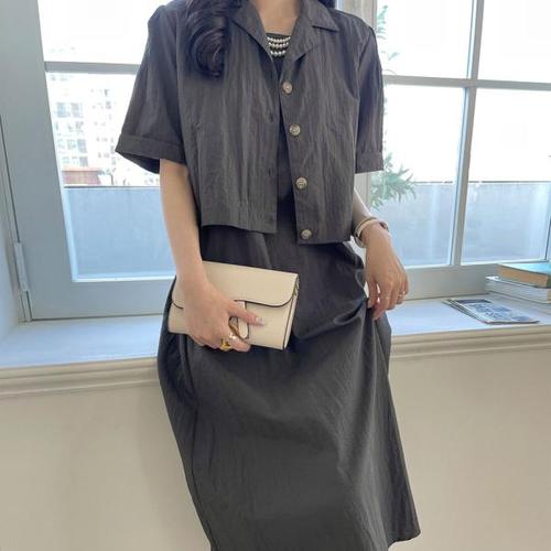 Latium HC06 A라인 플레어 주머니 원피스 숏짧은 카라 쟈켓 로이스바스락 투피스세트 T2523se03N