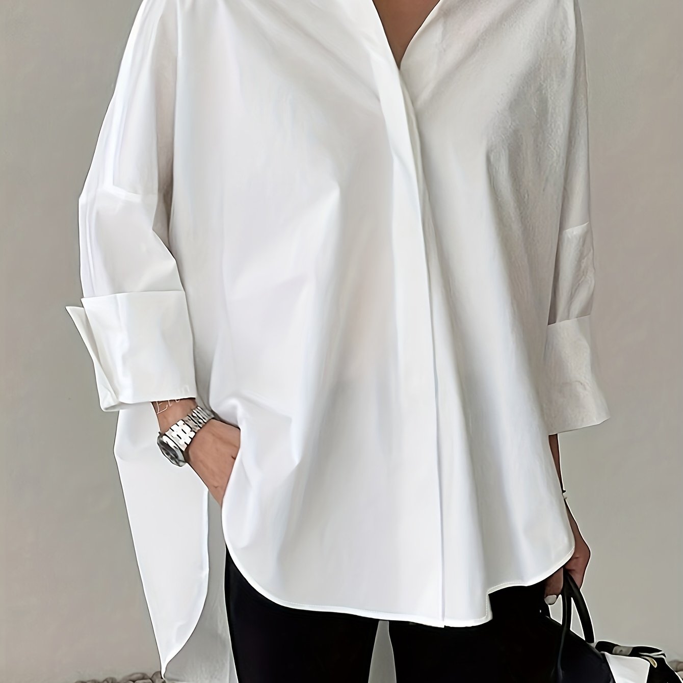 TEMU 플러스 사이즈 여성용 우아한 롱 블랙 셔츠 - 포인트 칼라 & 플레어드 헴, H라인 실루엣, 봄/가을 캐주얼&포멀 웨어, 기계 세탁 가능, 논스트레치 원단, 스타일리시 블라우스