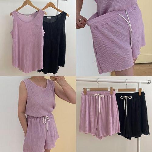 [옷자락]여자 라운드 와플반팔티 끈밴딩 반바지 투피스 세트_3