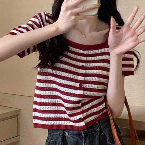 [셀러허브_여성트랜드패션]ONM 스트라이프 크롭 반팔 니트 바캉스룩 단가라 니트
