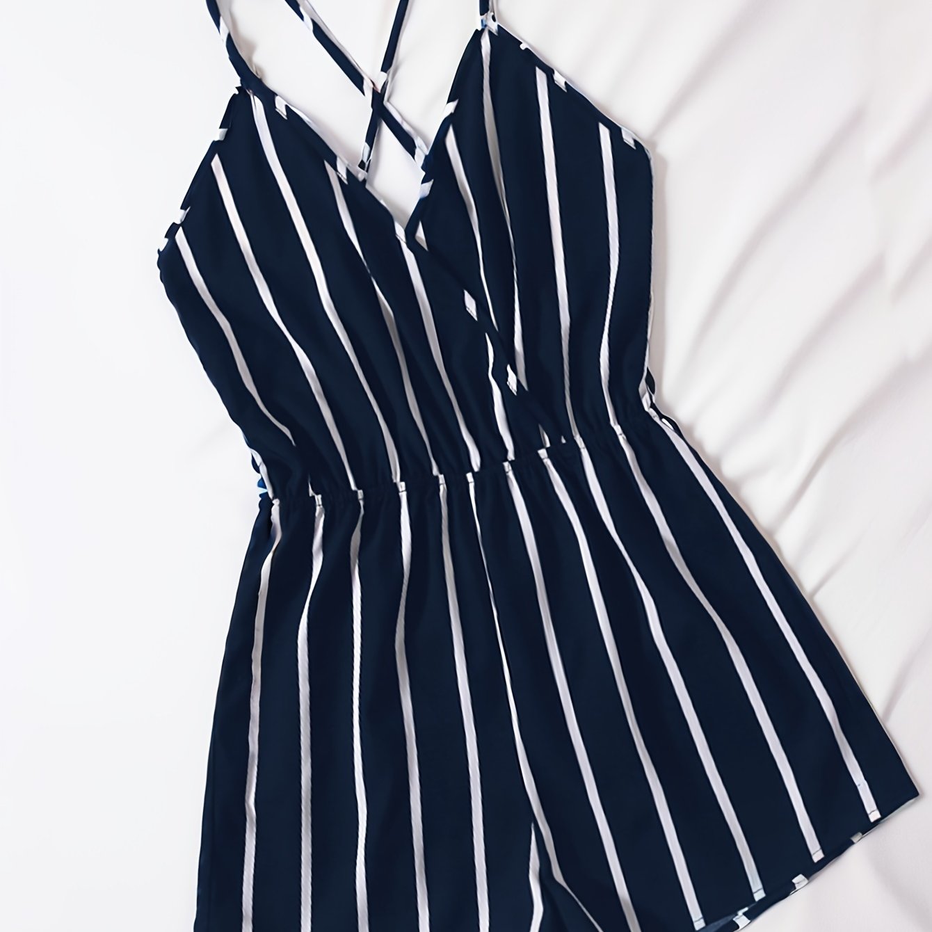 TEMU 여성용 V넥 백리스 스위퍼 반바지 - 블랙 앤 화이트, 캐주얼 비치웨어, 조절 가능한 스트랩, 여름 패션, 휴가 준비, 비치 옷