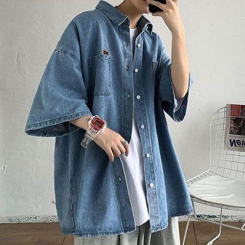 [에이치플러스몰]박스핏 곰돌이 포켓 데님 반팔셔츠 청남방 남녀공용