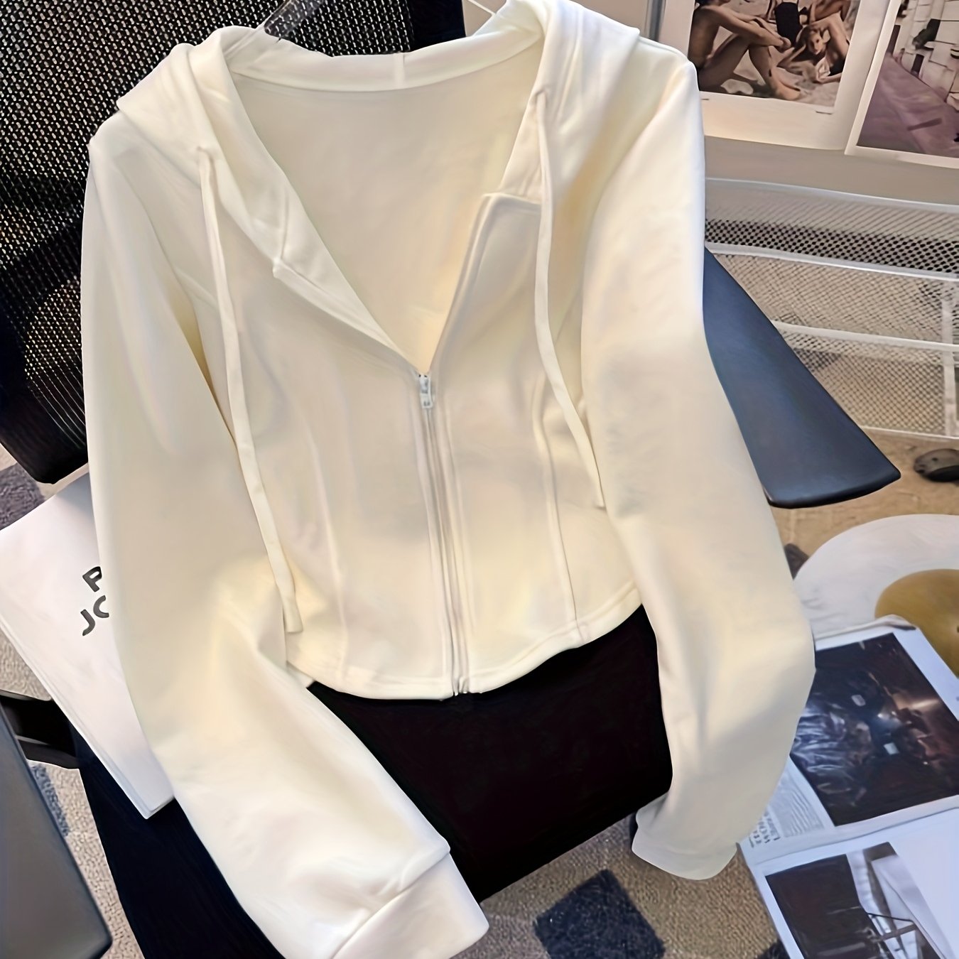 TEMU 솔리드 드로스트링 지퍼업 보온 안감 크롭 후드티