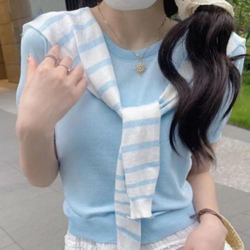 여성 스트라이프 여름 러블리 반팔 니트 어깨 숄 세트