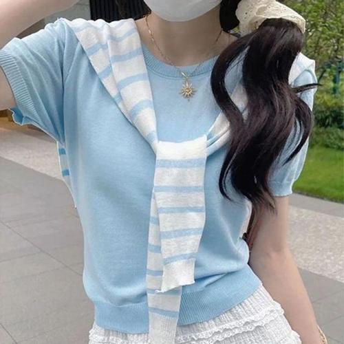 [신상오픈런]여성 퍼프소매 반팔 니트 세트 키치무드 스트라이프 숄