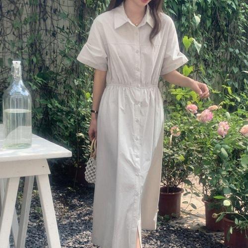[옷자락]여성용 심플 허리 스트링 카라 반팔 롱 셔츠 원피스