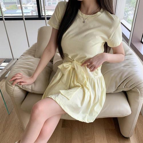 [옷자락]여성 무지 컬러 코튼 미니 반팔 원피스 리본 스트랩