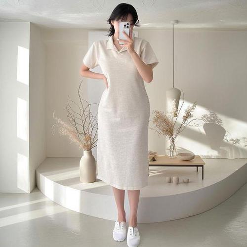 [다잇템][다잇템] 여자 롱 오픈 스트랩 카라넥 미니멀리즘 반소매 면혼방 원피스_22041444_588872