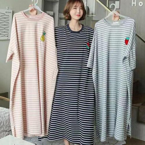 여성 데일리 단가라 롬 스트라이프 반팔 원피스 잠옷