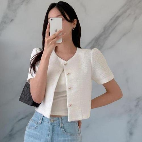 [다잇템]여성 독특한 단추 트위드 세미크롭 반소매 재킷