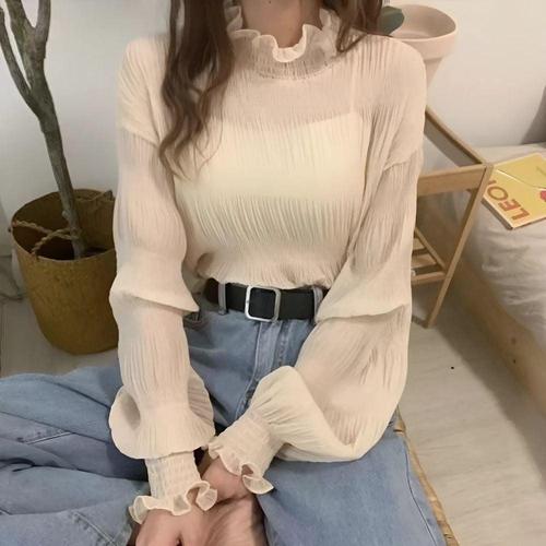 페미닌 주름 시스루 반폴라 블라우스 WFLS279