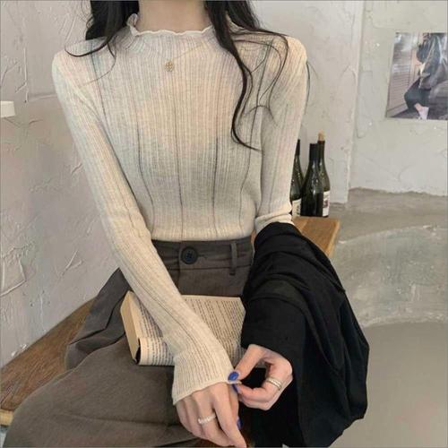 프릴 하프넥 반목티 골지니트 여성 슬림핏 긴팔 3색 WFKZVKF