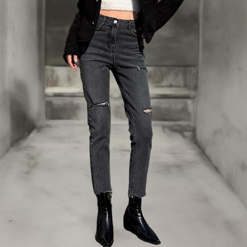 [하프클럽/]여자 블랙진 스키니 컷팅 구제 반하이 스판 청바지