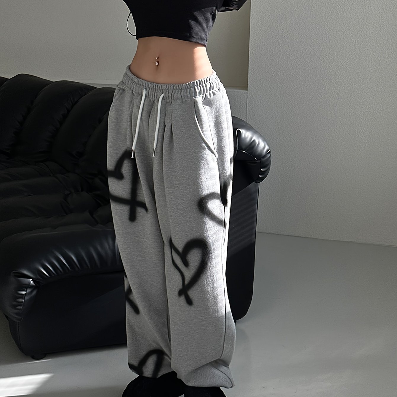 TEMU 하트 그래피티가 돋보이는 하이웨이스트 드로스트링 스웨트팬츠 & 캐주얼 바지, 인스 스타일의 편안한 가을/겨울 의상|냉장고바지|바지|여성의류