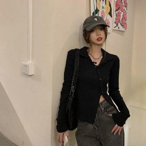 카라 단추 탑 티셔츠 바디라인 강조 캐주얼 간절기 밑단 밴딩 데일리 배꼽 크롭 스타일