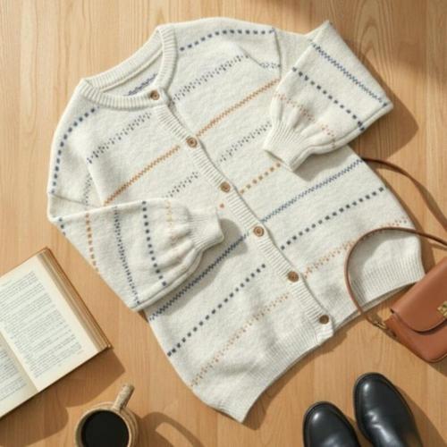 [신상오픈런]여성 사랑스러운 울 스트라이프 벌룬 소매 니트 카디건