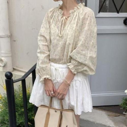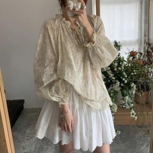 [신상오픈런]여성 프릴 넥 블라우스 잔꽃 패턴 루즈핏 벌룬 소매