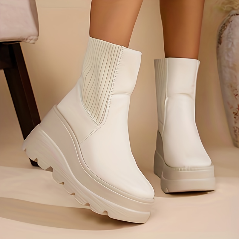 TEMU 여성용 겨울 슬립온 청키 플랫폼 앵클 부츠, 두꺼운 TPR 밑창 & 인조 소재 - 라운드 토 로우컷 힐 (베이지//블랙) - 청바지, 드레스 및 캐주얼 복장에 따뜻한 캐주얼