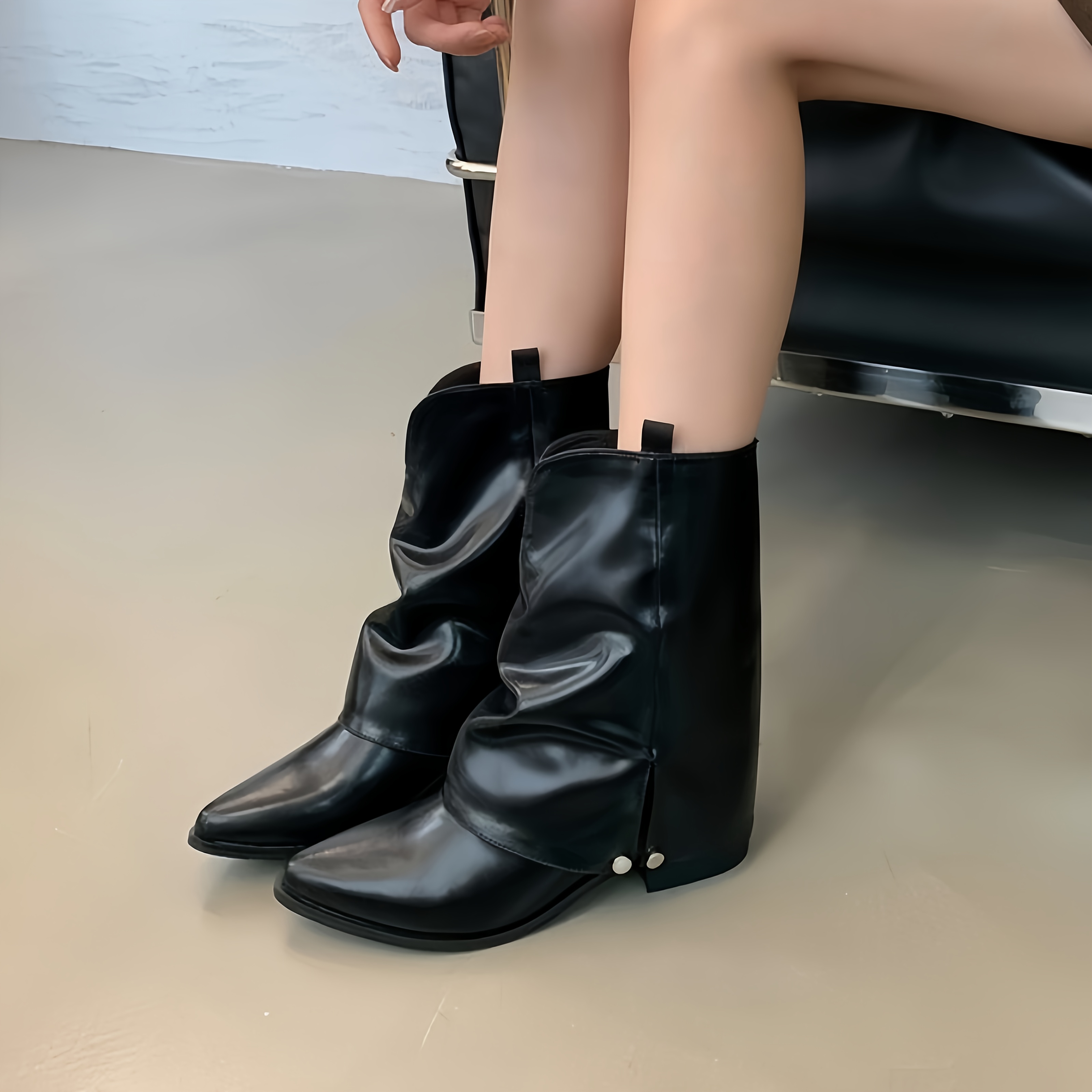 TEMU 여성 레트로 청키 힐 포인티드 토 슬립온 부츠 - 글로시 블랙 인조 커버 미드-카프 부츠, 지퍼 클로저, 우아한 프렌치 힐 & 커프, 올 시즌 활용 가능한 드레스 부츠, 캐주얼 & 포멀 의상, 여성 부츠, 여성 부츠 우아한 클로즈
