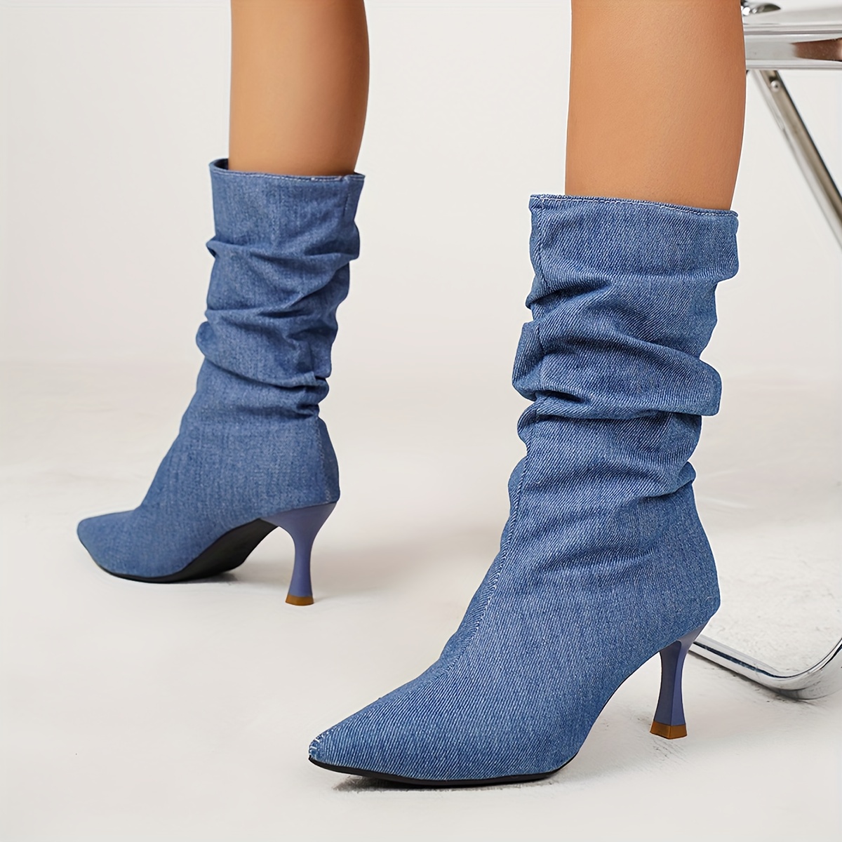 TEMU 여성용 뾰족한 앞코 프렌치 블록힐 부츠 - 슬립온 드레스 부츠, 패브릭 갑피 & 고무 밑창 - 데님/드레스에 어울리는 사계절 캐주얼 부츠 (유럽 스페셜 라인 컬렉션)