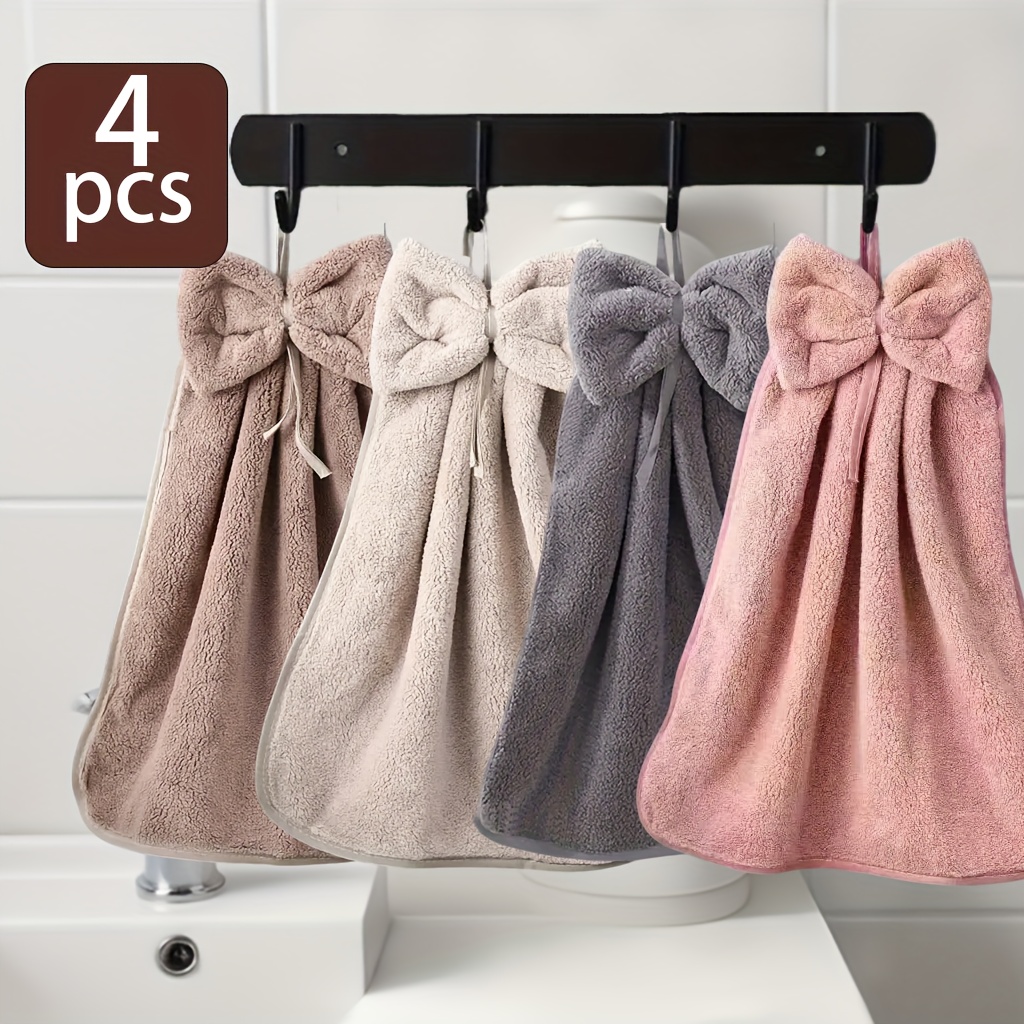 TEMU 4개 울트라-파인 파이버 코랄 플리스 핸드 타월, 14.57x11.81인치 - 높은 흡수력 & 부드러움, 현대적인 리본 모양 디자인과 걸이 링, 주방 및 욕실 사용에 완벽, 욕실 필수품|현대적인 타월 디자인|부드러운 질감, 욕실용 핸드 타월