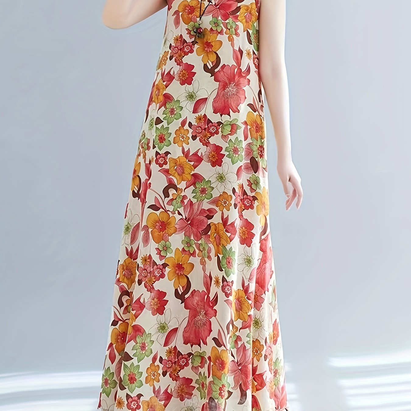 TEMU 2023년 신제품 플러스 사이즈 꽃무늬 맥시 드레스 - 소매 없는, 우아한 여름 드레스, 밝은 빨강, 오렌지, 노란색 꽃무늬, 여유로운 핏, 긴 길이, 캐주얼하고 공식적인 자리, 캐주얼한 의상에 적합, 우아한 소매 없는 드레스, 플러스 사이즈 드레스