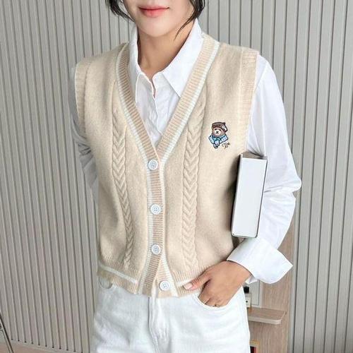 [에이치플러스몰]캔캔 모자곰 라인 오픈 베스트 241007 조끼 곰돌이자수 여성 울 가을 베어자수 니트베스..