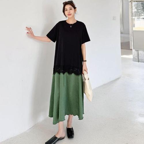 [무드무드] 라구 레이스 배색 반팔 롱 원피스
