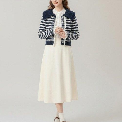 [핑크엘리제]스트라이프 레이스 배색니트 드레온니트가디건