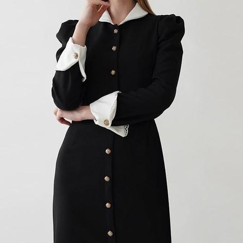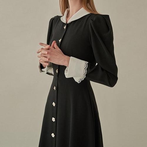 [러빙엠]블랙 배색 카라 소매 레이스 어깨 퍼프 롱 원피스 (6449567)