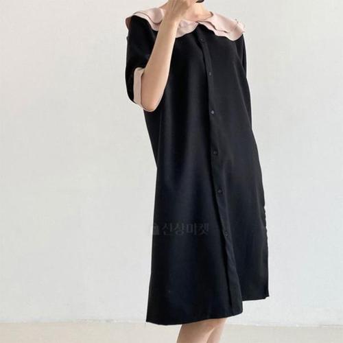[옷자락]여자 상견례룩 배색 카라넥 블랙 레이스반팔 롱원피스