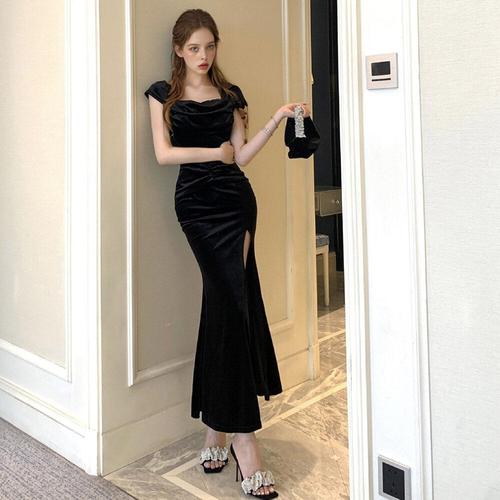 POMTOR 가을 겨울 블랙 스퀘어넥 롱 벨벳 원피스