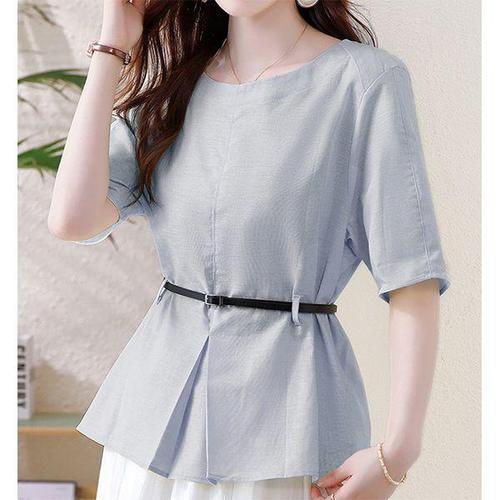 [패션시그널]벨트디테일 솔리드 라운드넥 블라우스 437F4F
