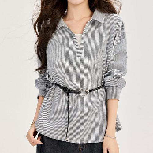 [퀸이즈] [벨트+셔츠set][~77까지]베키 스트라이프 벨티드 포인트 카라 블라우스