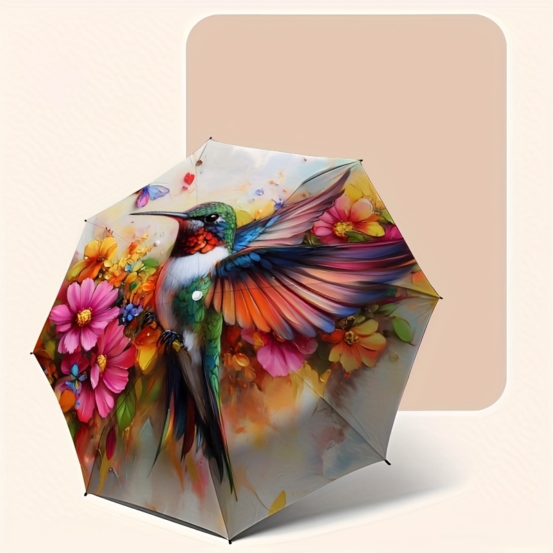 TEMU 자동 접이식 및 방풍 기능을 갖춘 생동감 넘치는 벌새와 꽃무늬 우산. 튼튼하고 내구성이 뛰어난 8개 리브가 있는 야외용 우산으로 편리한 휴일 선물로 적합합니다