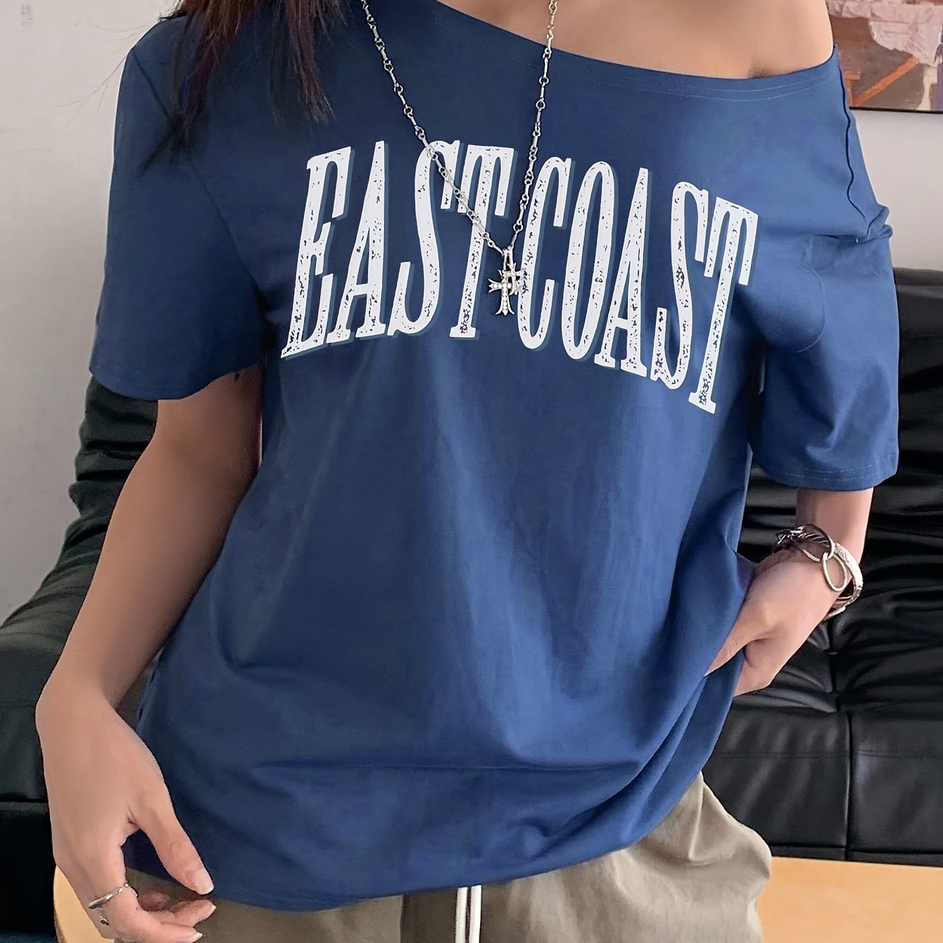 TEMU 새로운 아메리칸 스타일 여성용 여름 오프숄더 캐주얼 스포티 반팔 티셔츠, 레터 프린트 및 크로스오버 숄더 넥라인