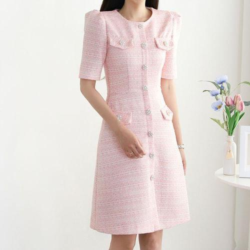 [모리스커밍홈]보석단추 반팔 트위드 원피스_M2405OP080B