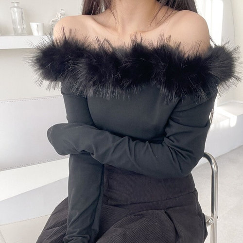 플러리싱 / 보송 밍크 퍼트리밍 오프숄더 긴팔티 플러리싱