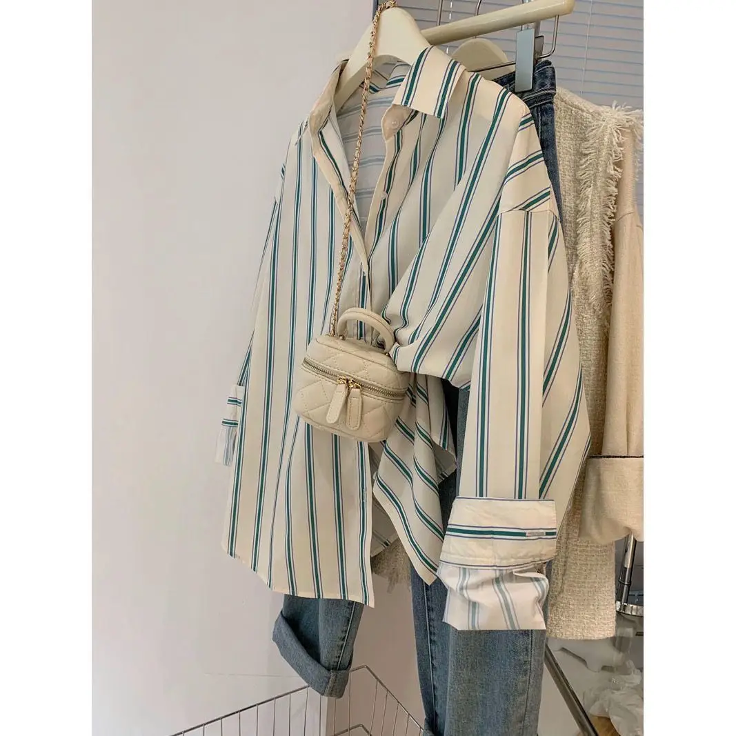 한국 스타일 부드러운 줄무늬 셔츠 여성 봄 가을 새로운 디자인 독특하고 우아하고 아름다운 다용도 긴팔 탑