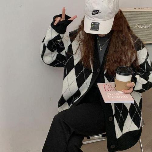 [셀러허브_여성트랜드패션]ONM 2컬러 모던한 아가일패턴 배색가디건 봄 가을 루