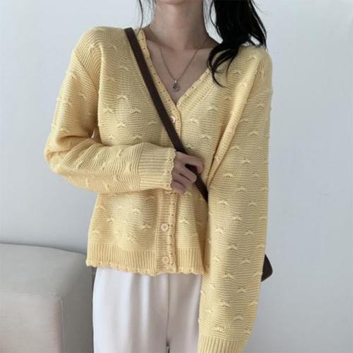 [옷자락]여자 노랑색 분홍색 봄니트 여리핏 패턴 브이 가디건