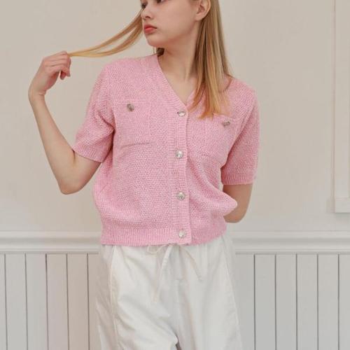 [브이와이][VY] 여자 은장단추 주머니 분홍색 V넥 부클반팔 가디건_16651288_588847