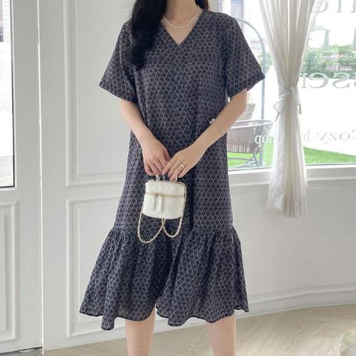Latium HC06 브이넥 앞오픈 모디 잔플라워 A라인 플레어 반팔롱원피스 T2523op12B