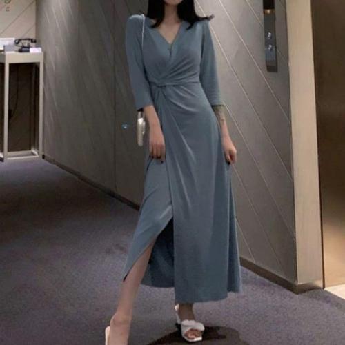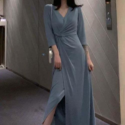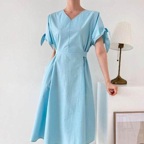 [다잇템]여성 롱 귀여운 소매꼬임 V넥 마원단 원피스